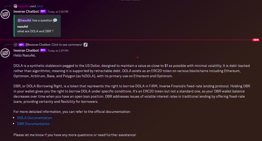 1. **Initiate a Query**: Simply type `/doc` followed by your specific question or keywords in any Discord channel where the Flaskbot is active. For example: `/doc what are DOLA and DBR ?`