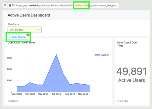 If you want this to happen periodically you can activate Automatic Dashboard Refresh from the UI by clicking the dropdown pictured below. Or you can pass a refresh query string variable with your dashboard URL. The allowed refresh intervals are expressed in seconds: 60, 300, 600, 1800, 3600, 43200, and 86400.