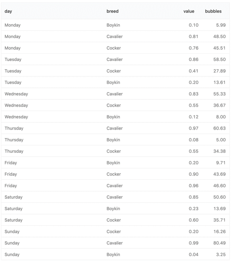 The charts in the above animation were all produced from the following tabular result: