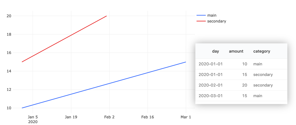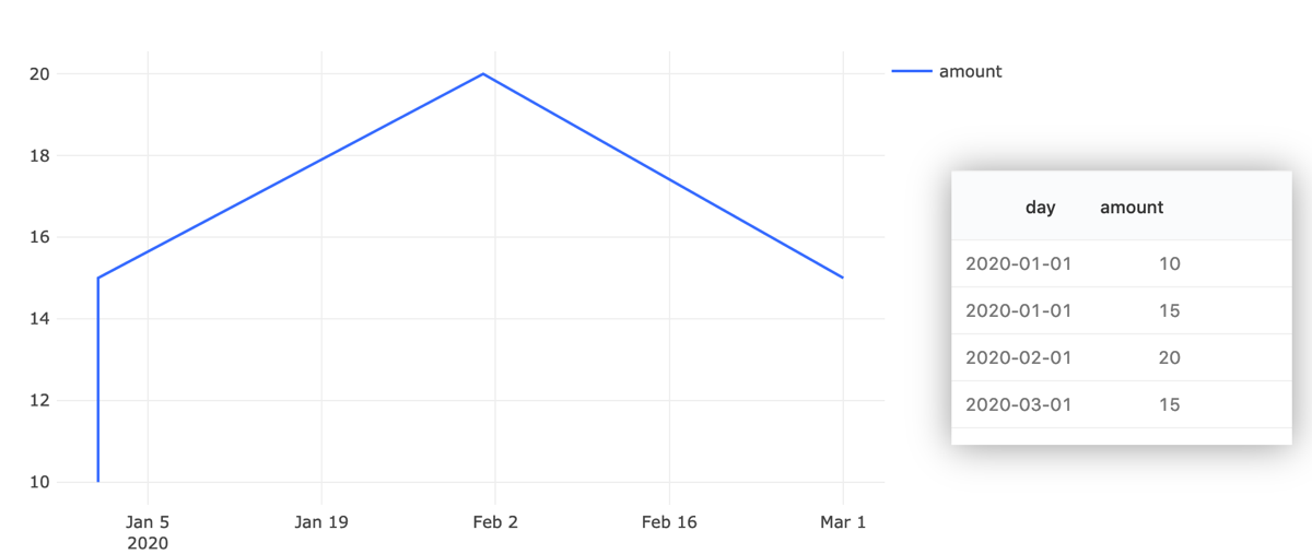 The application is smart enough to figure out most common X axis scales: timestamps, linear, and logarithms. But if it can’t parse your X column into an ordered series, it falls back to treating each X value as a “category”. This can have mixed results: