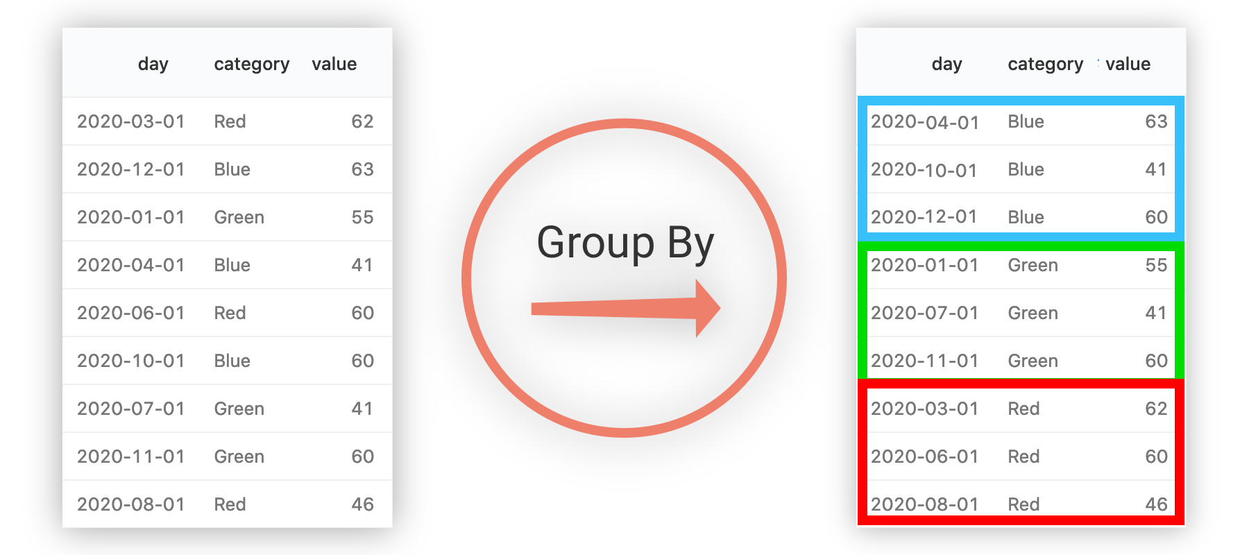 As shown in the below example, the grouping column is used to sort (x,y) pairs together.