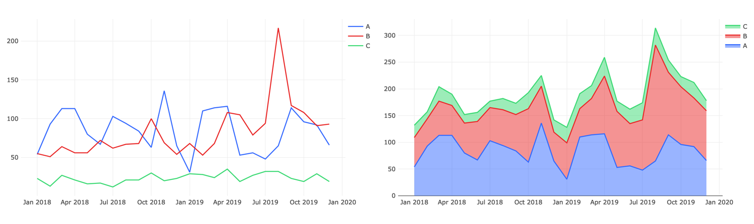 The application can “stack” your Y axis values on top of one another. The name name is borrowed from Stacked Bar Charts, but it can be useful with area charts as well. The below image shows the same data, unstacked on the left and stacked on the right.